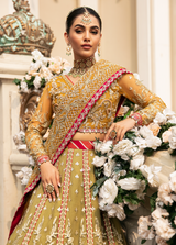 Diya in a vibrant palette of green, mustard, and coral - a visual symphony of colors that radiates elegance and grace. Embrace the beauty of tradition with a modern twist and make a bold and stylish statement at any special occasion with this extraordinary ensemble.